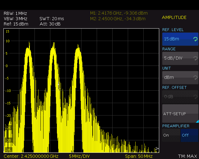 There is a 10dB attenuator on the spectrum analyzer to protect the input, so add 10 dB to the value on the picture, the real power is 18dBm.