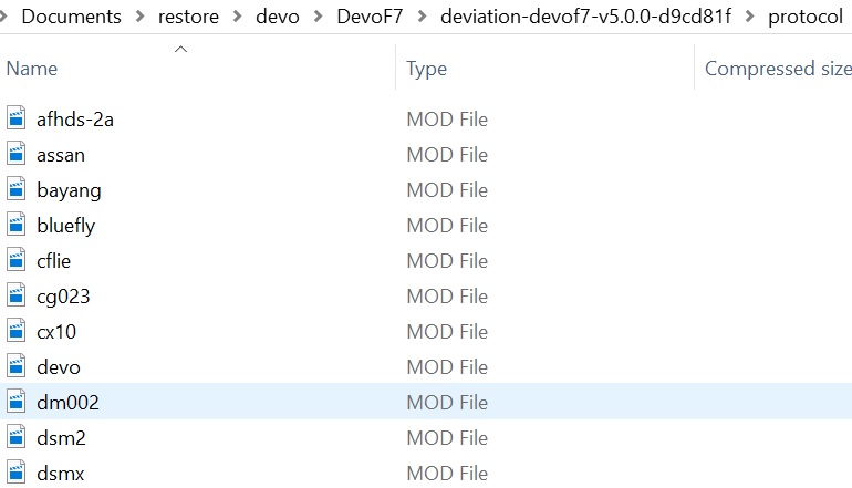 planetfpv wrote: So I found a thread suggesting to also read the devo f4 thread and got a lot of help from that. On my devo f7 I was able to get dsmx and dsmx and devo protocols. I ordered my 4 in 1 so I can use my frsky receivers.