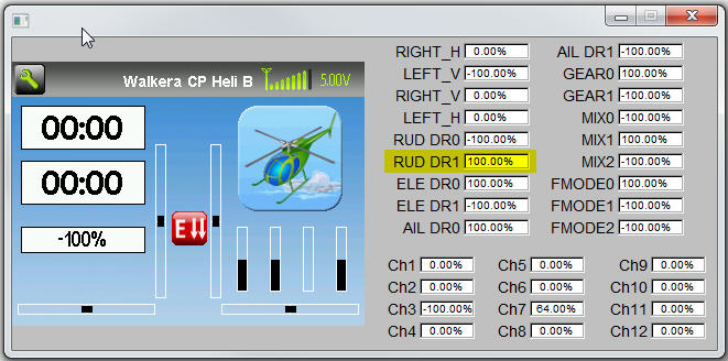 64% for Normal and Stunt modes. This value is equal to the Walkera firmware value of 82% gyro gain.