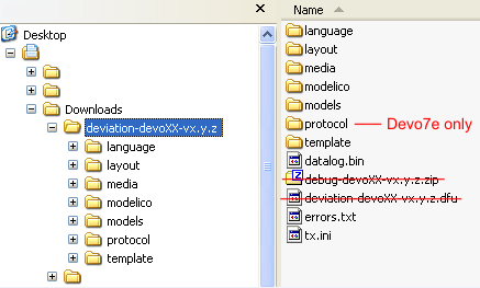如果你要升级旧版本的 Deviation 固件,强烈建议你备份遥控器“Models” 目录以及"tx.ini”和“hardware.ini”文件,以确保你不会丢失任何的模型或遥控器配置。
