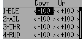 舵机行程调整页面设置每个舵机的最大正/负行程。这相当于高级模式 GUI混控菜单的通道设置子页面上的“比例+”“比例-”设置(见通道设置)。可接受 的“比例-”值从-175 到-1,“比例+”值的范围从+1 到+175。默认值分别为-100至+100。