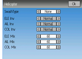 Cyclic1, Cyclic2, Cyclic3: The 3 outputs of the helicopter swash-plate mix. These will represent the 3 servos connected to the helicopter swash-plate (see Swash Configuration).