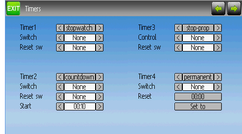 「Permanent」タイマーは走行距離計に似ており、その値はmodel.iniファイルに保存されています。送信機の電源を入れても、以前の値が維持されます。「Set to」ボタンを使用してタイマーを設定し、「Reset」ボタンを押すことでリセットできます。